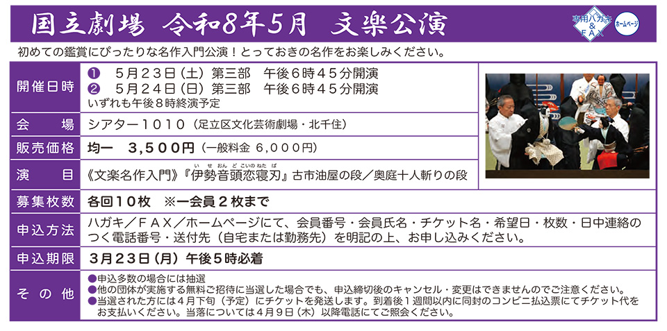 国立劇場 令和8年5月 文楽公演❶ 5月23日(土)第三部 午後6時45分開演