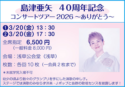 島津亜矢 40周年記念 コンサートツアー2026 ~ありがとう~ ❶3/20(金)13:30