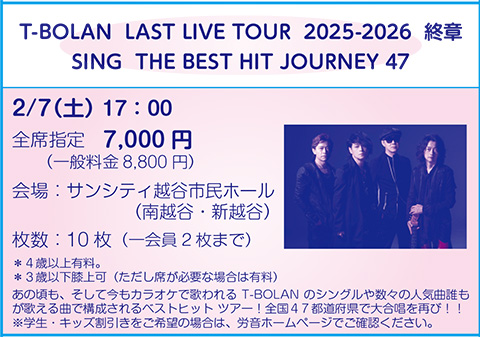 T-BOLAN LAST LIVE TOUR 2025-2026 終章 SING THE BEST HIT JOURNEY 47 申込期間終了